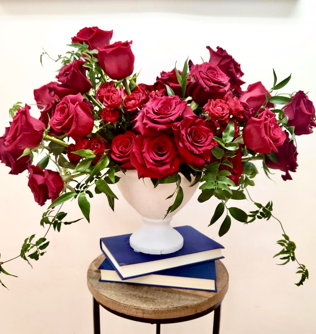 This design is named “Jo” after the bold and independent character of Jo March from the novel Little Women. We love the airy display of untamed wildflowers, red roses, and wispy greenery overflowing from this arrangement. Celebrate your unique love this Valentine’s Day with this one-of-a-kind floral design.