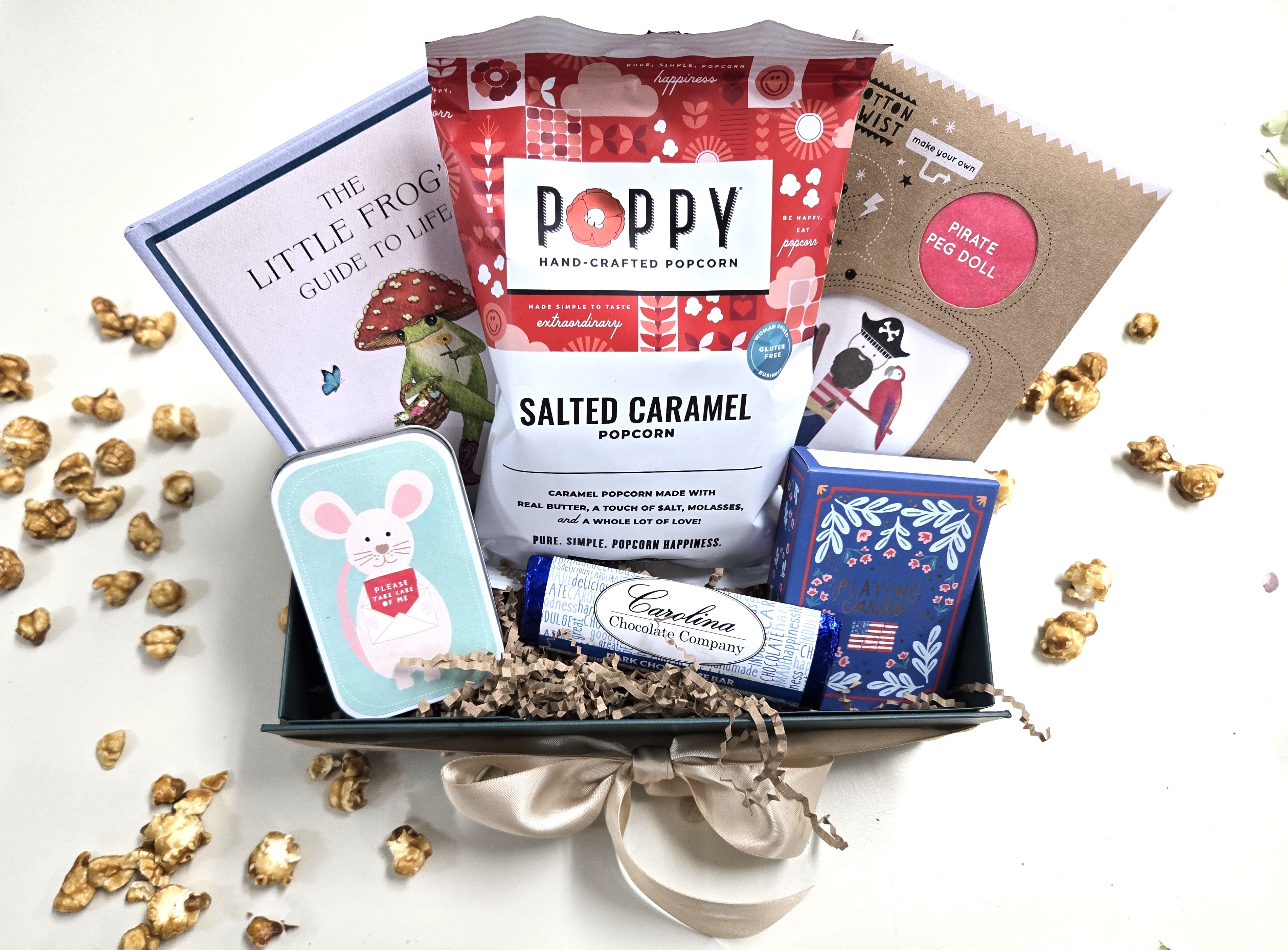 Make their day extra special with this cheerful box, thoughtfully packed with treats and surprises! Inside they’ll find Poppy Handcrafted Popcorn, a Carolina Chocolate Company chocolate bar, a make-your-own Pirate Peg Doll craft, a deck of illustrated playing cards, The Little Frog’s Guide to Life book, and an adorable Pocket Pet in a Tin.
