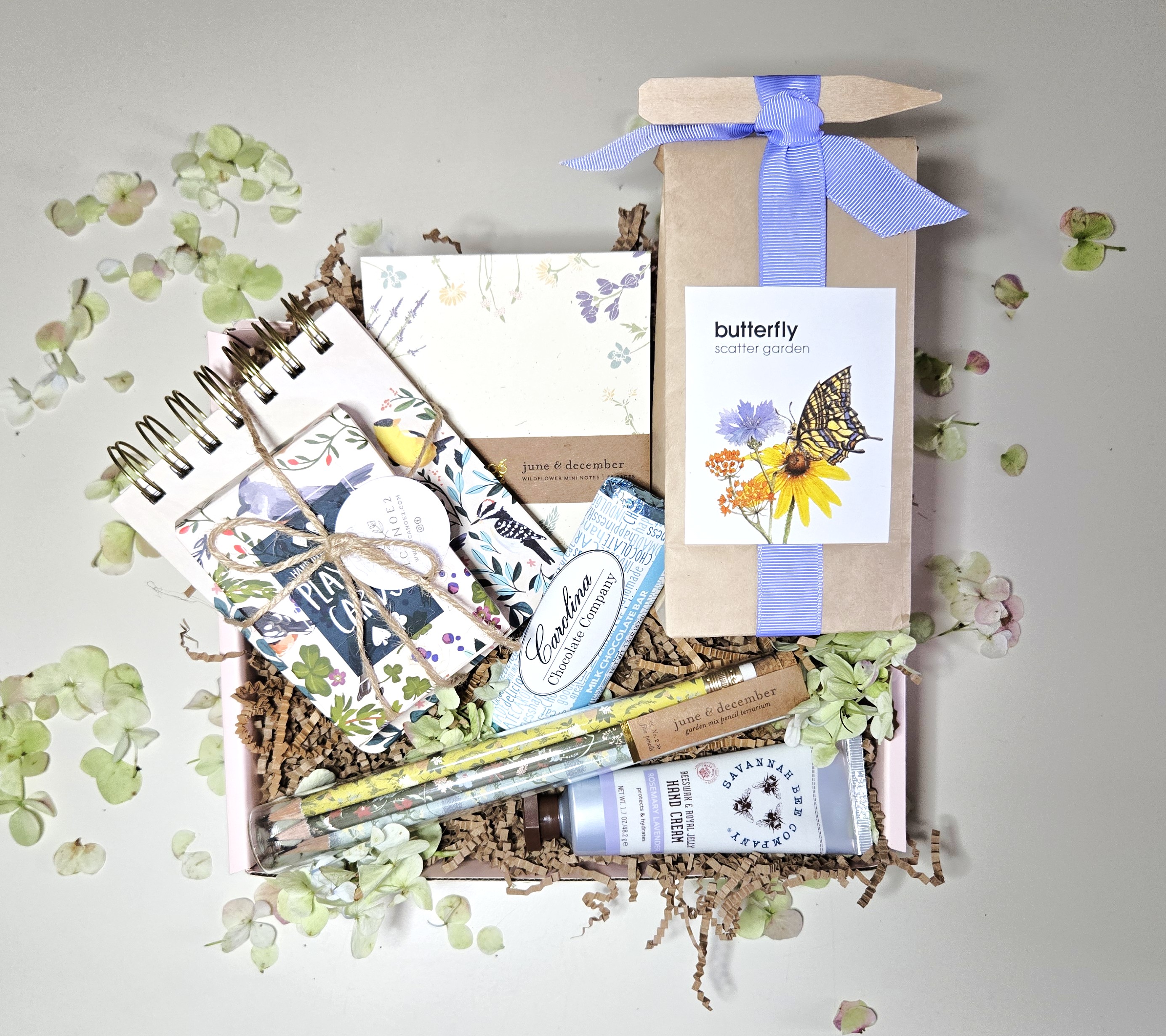 Delight someone special with this charming, nature-inspired collection — perfect for birthdays, thank-yous, or thoughtful pick-me-ups. Each box includes a Butterfly Scatter Garden kit, floral stationery from June & December, a Savannah Bee Company hand cream, Carolina Chocolate Company chocolate bar, plantable wildflower paper, and other artisan touches that celebrate blooms, bees, and butterflies.
