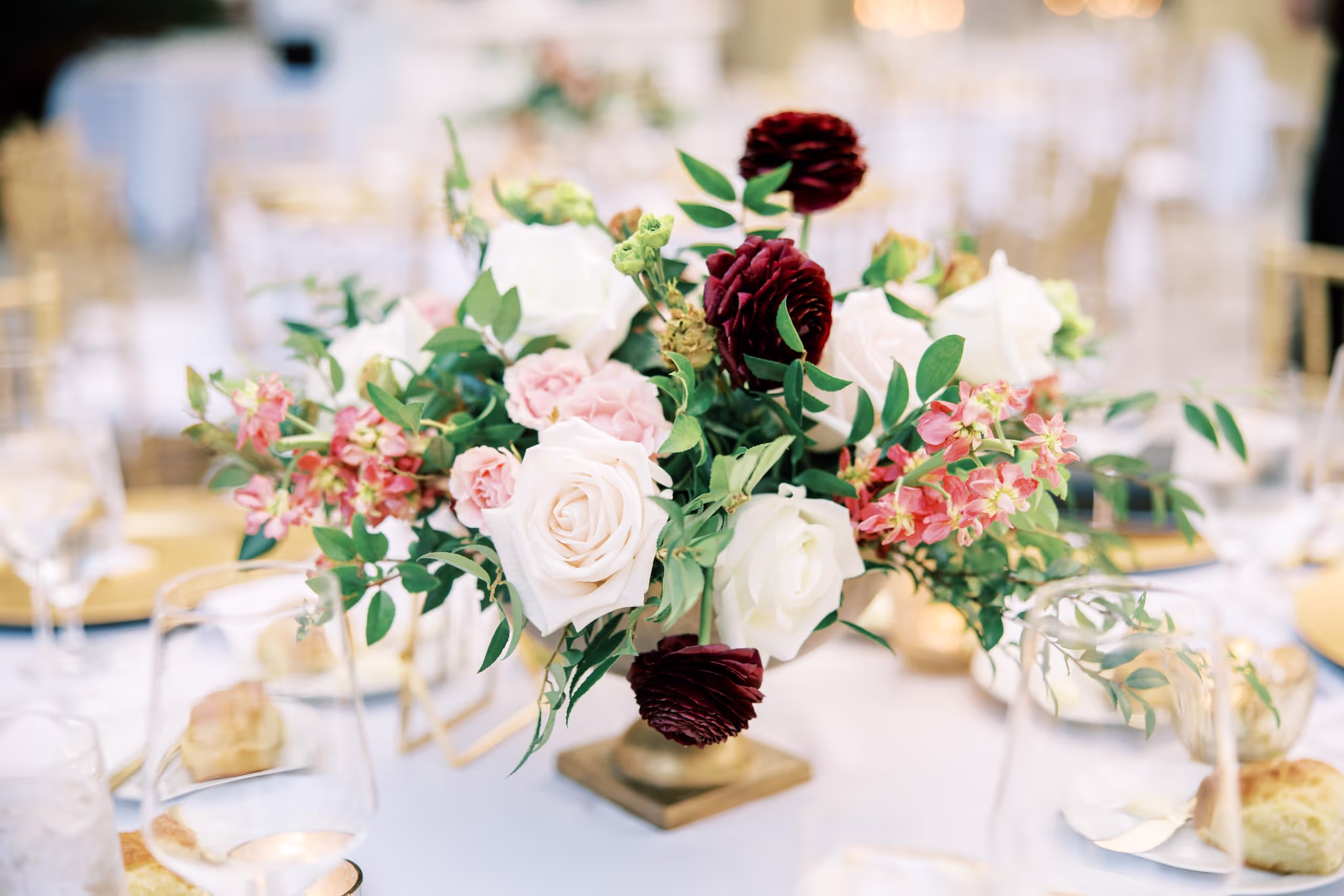 A stunning floral arch, wispy greenery, and the perfect placement of burgundy blooms make for a memorable William Aiken House wedding.